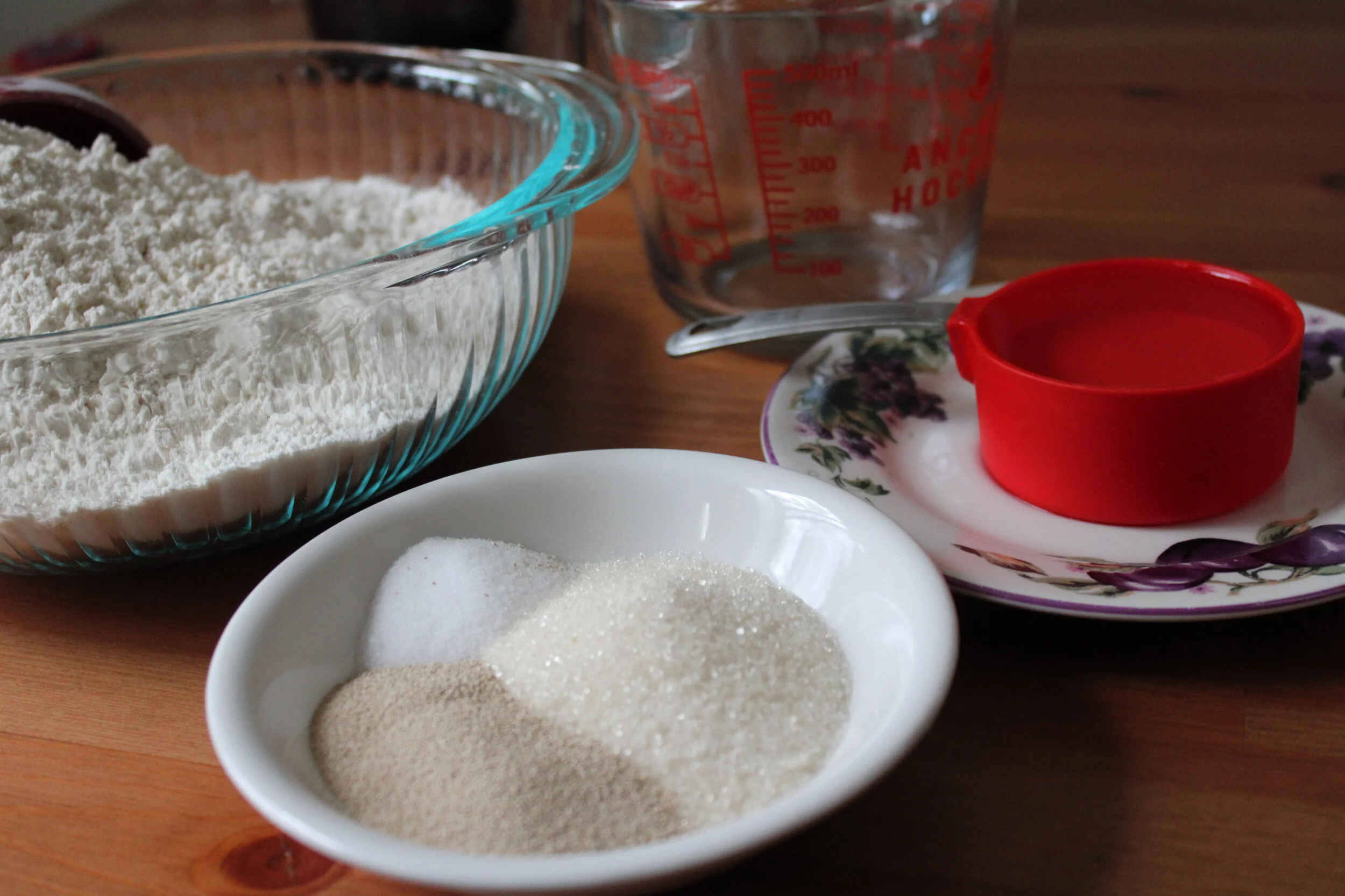 piles of sugar, salt, yeast, and flour