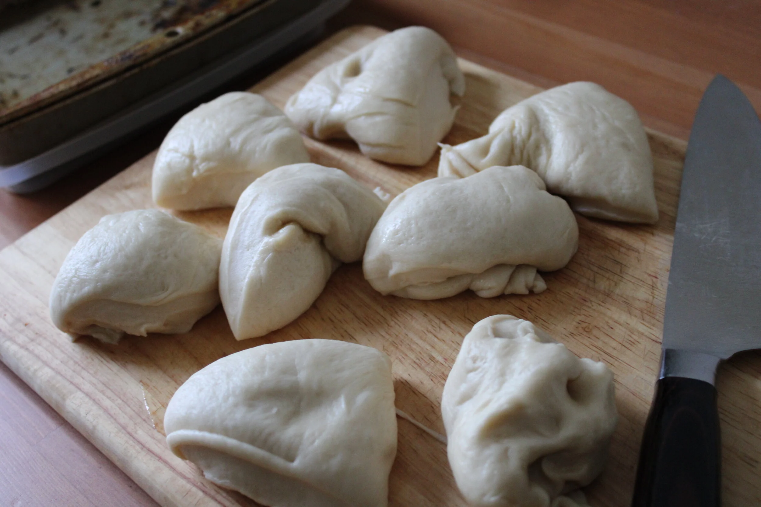 Seventh~ lay out on work surface and have an oiled pan ready. Cut into 1/2, then 1/4 and 1/8 an finally 1/10 or 1/12. Shape into balls and rest again to rise again. Then bake for 10-15 min.