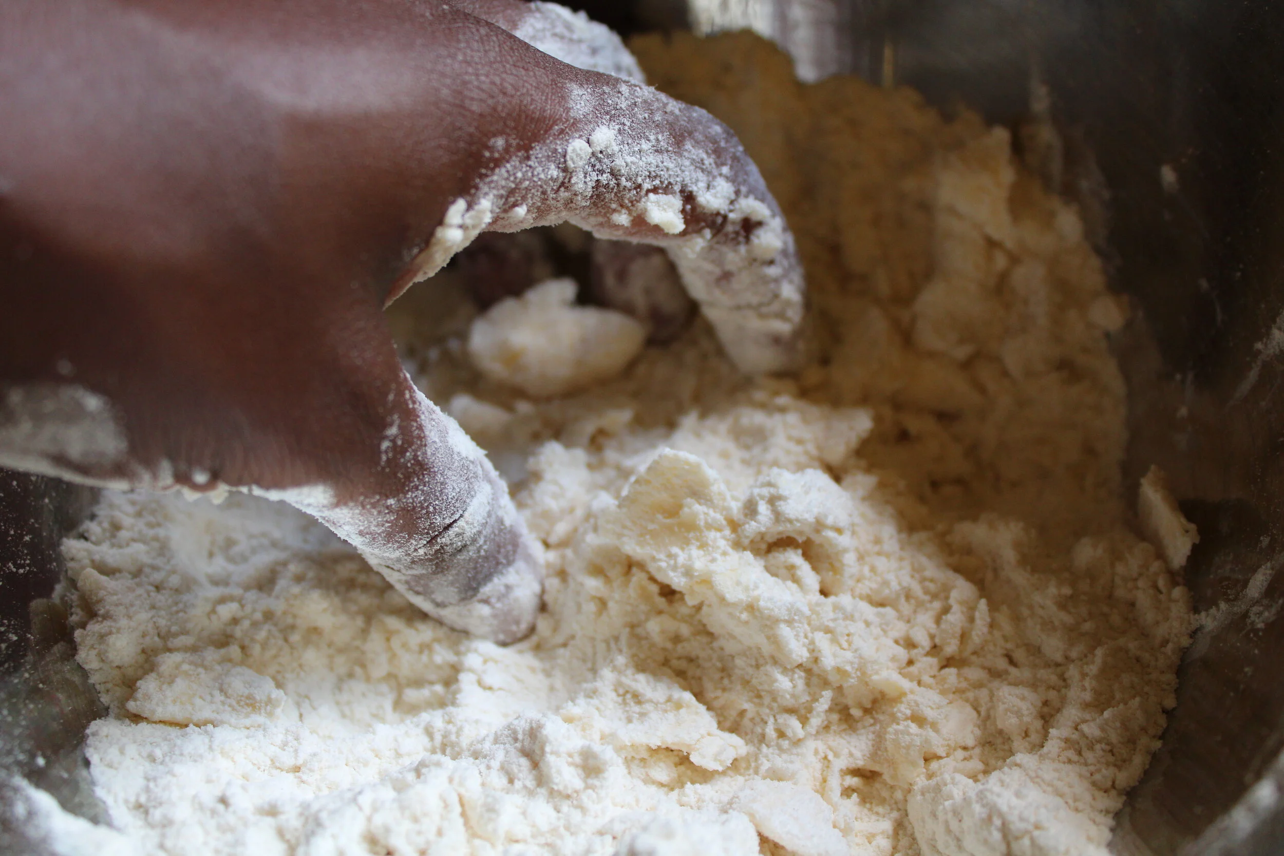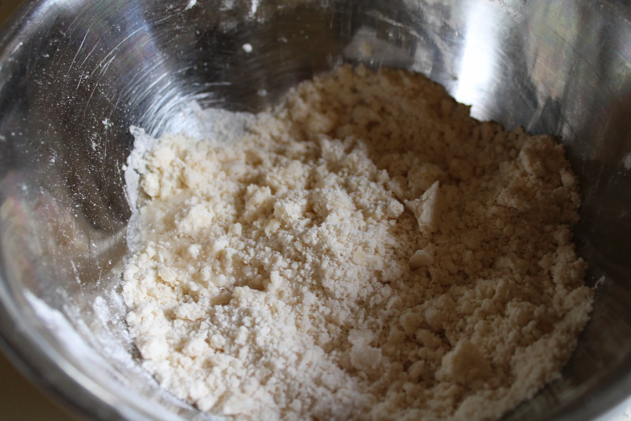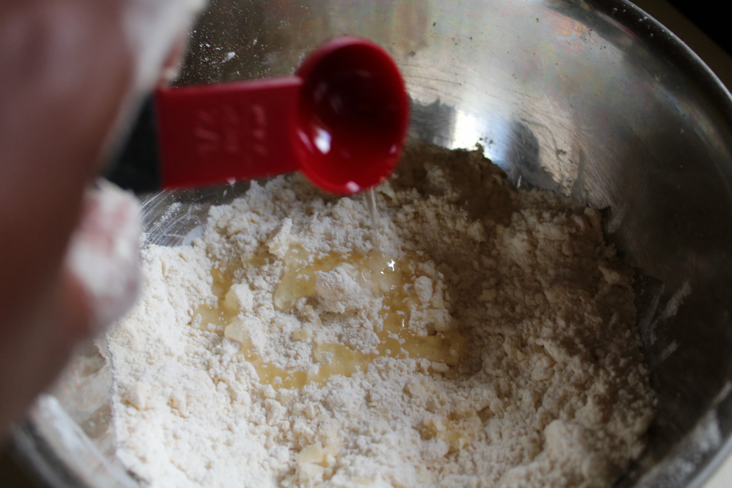 Combine the dry ingredients in a large bowl, then add in chilled butter and incorporate with a fork to create a coarse mixture. Then stream in the oil and water, 1 tablespoon at a time, being careful to notice when the dough is starting to form large clumps and become moistened. Alternatively you can do this in a food processor running.