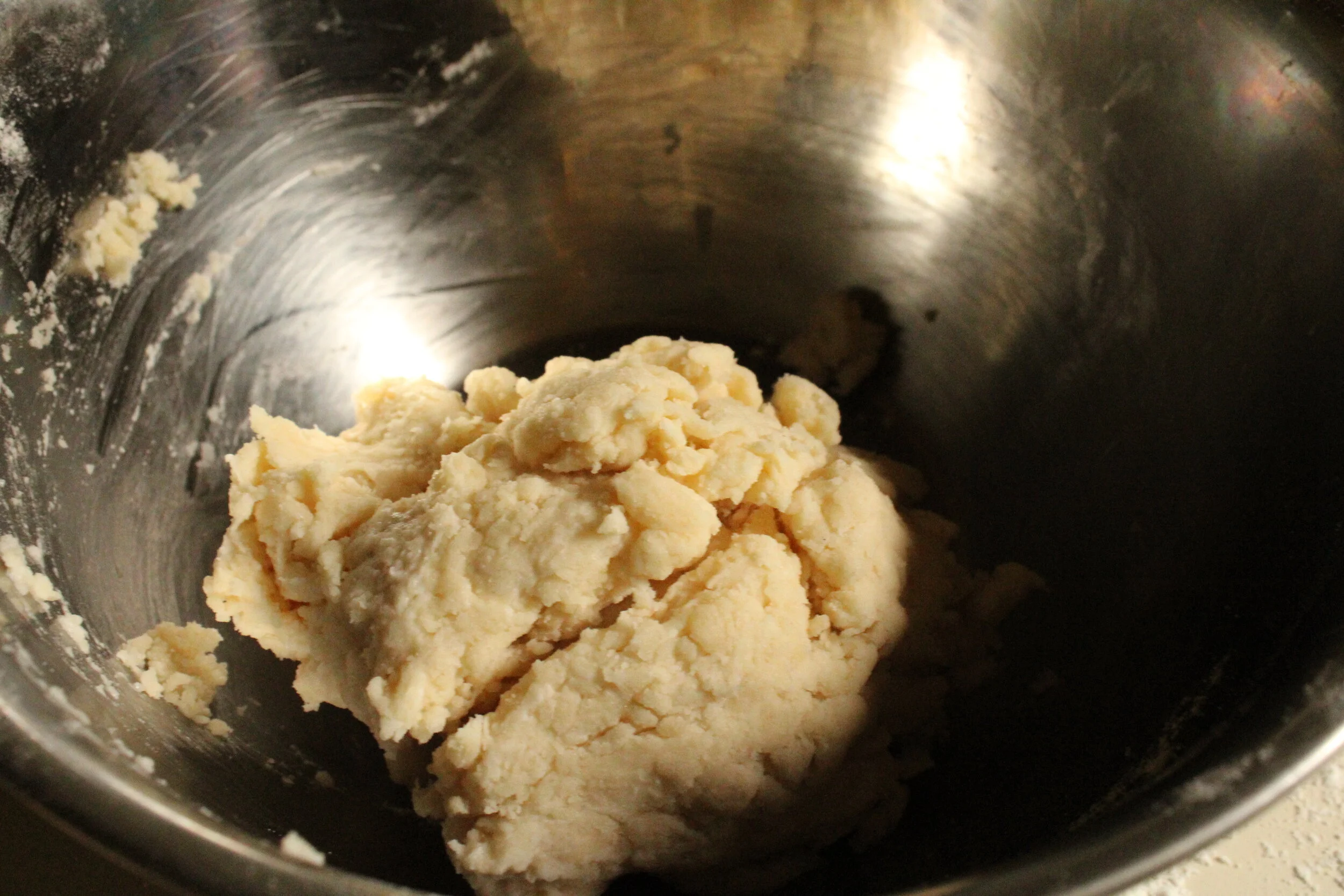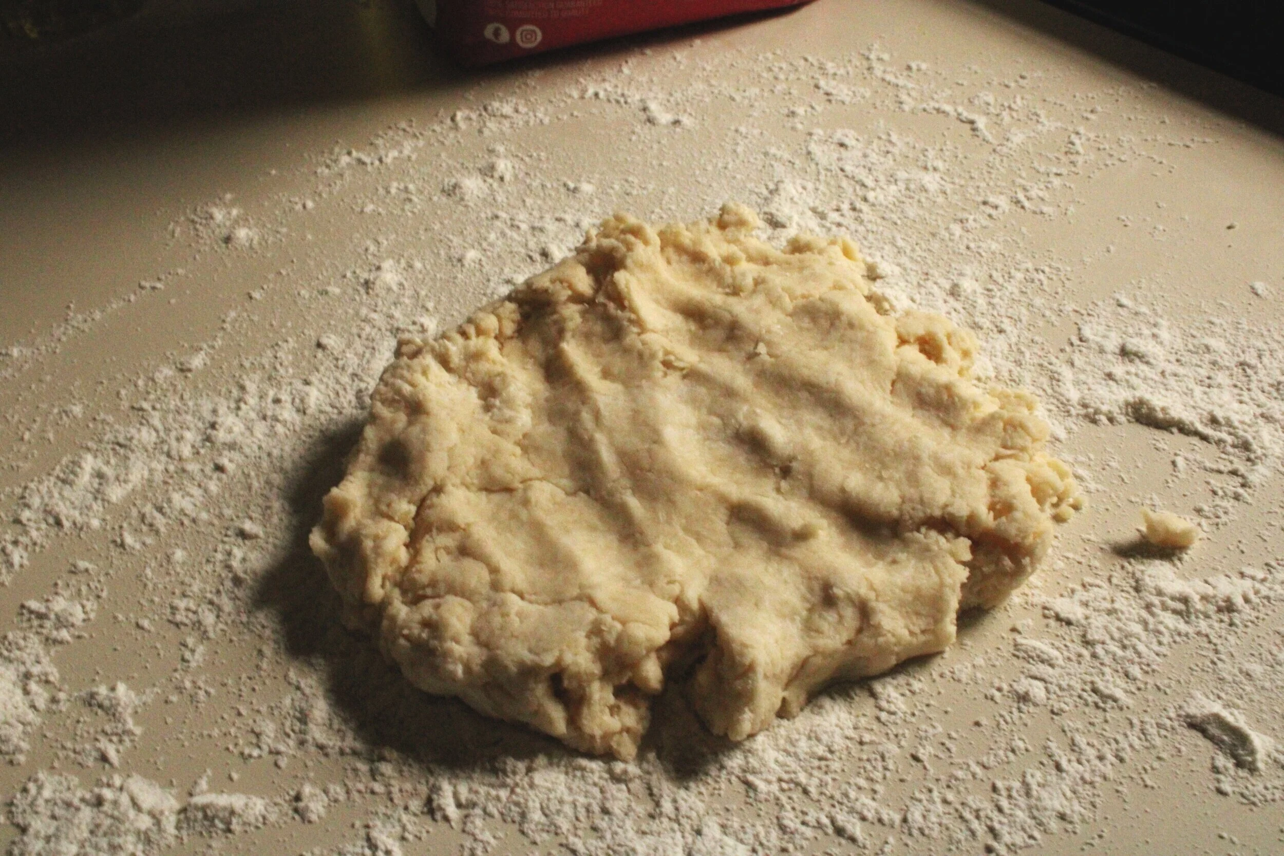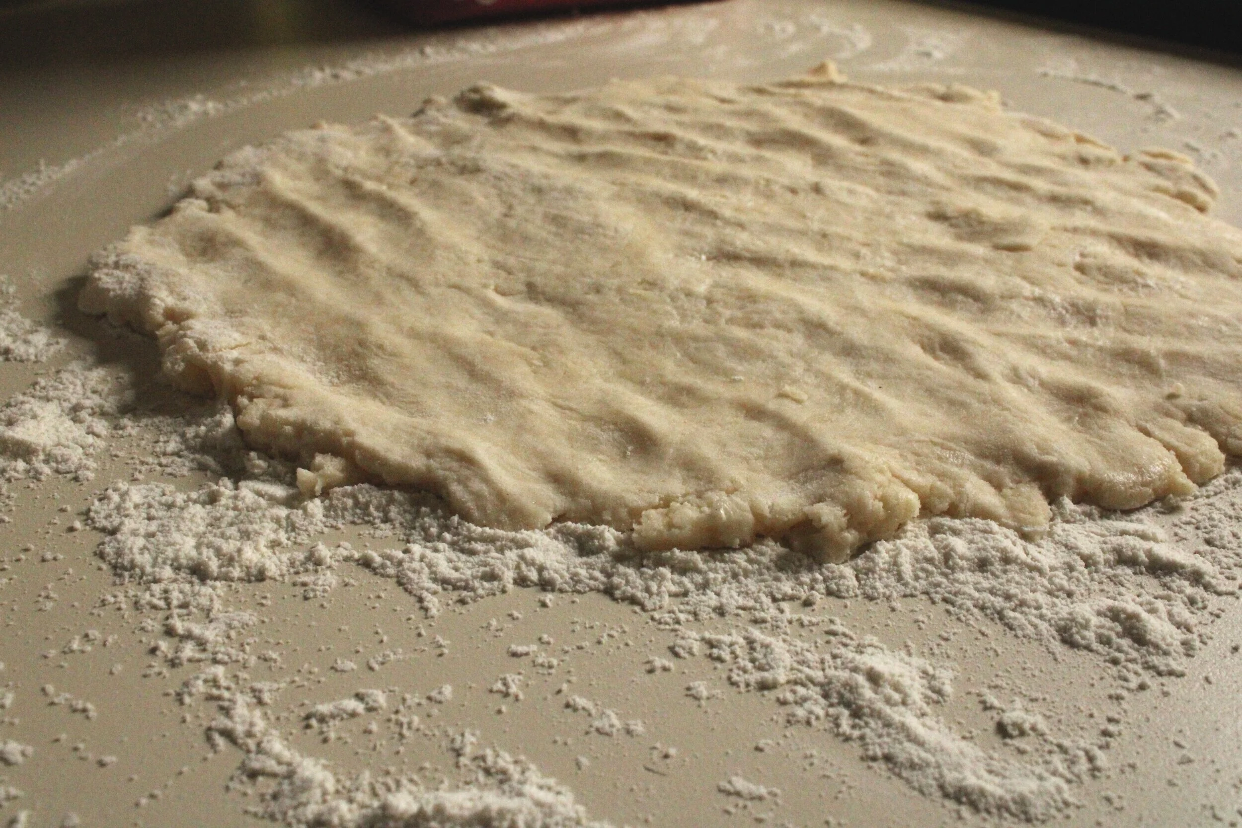 When the dough begins to take shape, turn it out onto a well-floured surface and squeeze it together to form a ball. Give one to two kneads, then sprinkle some flour on top of the dough and roll it out to about 1/4 inch thickness.