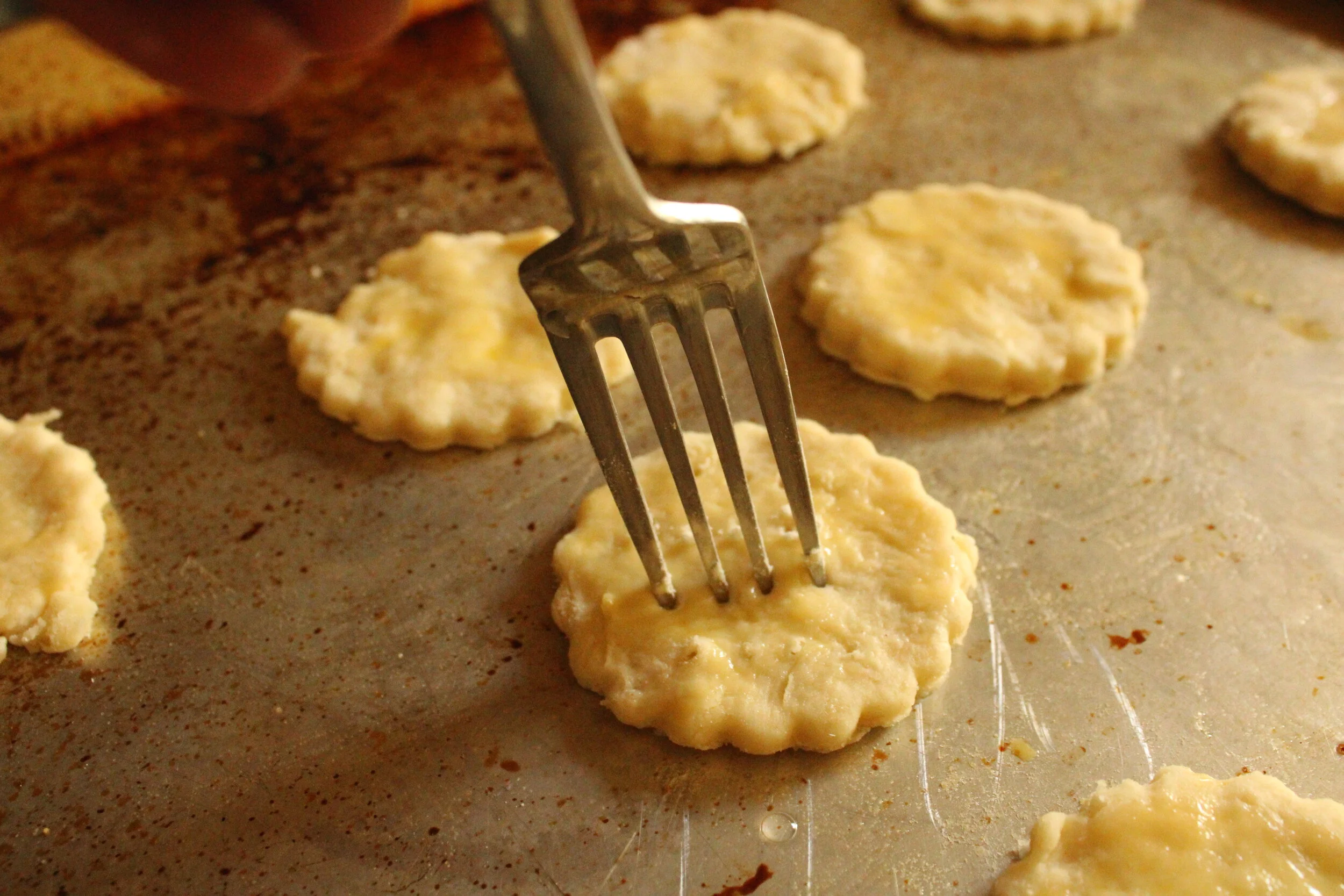Before cutting the crackers, use a fork to prick the dough all over. Then with a small cookie cutter (I like fluted ones like this), cut out the crackers and carefully place them on the prepared baking sheets.