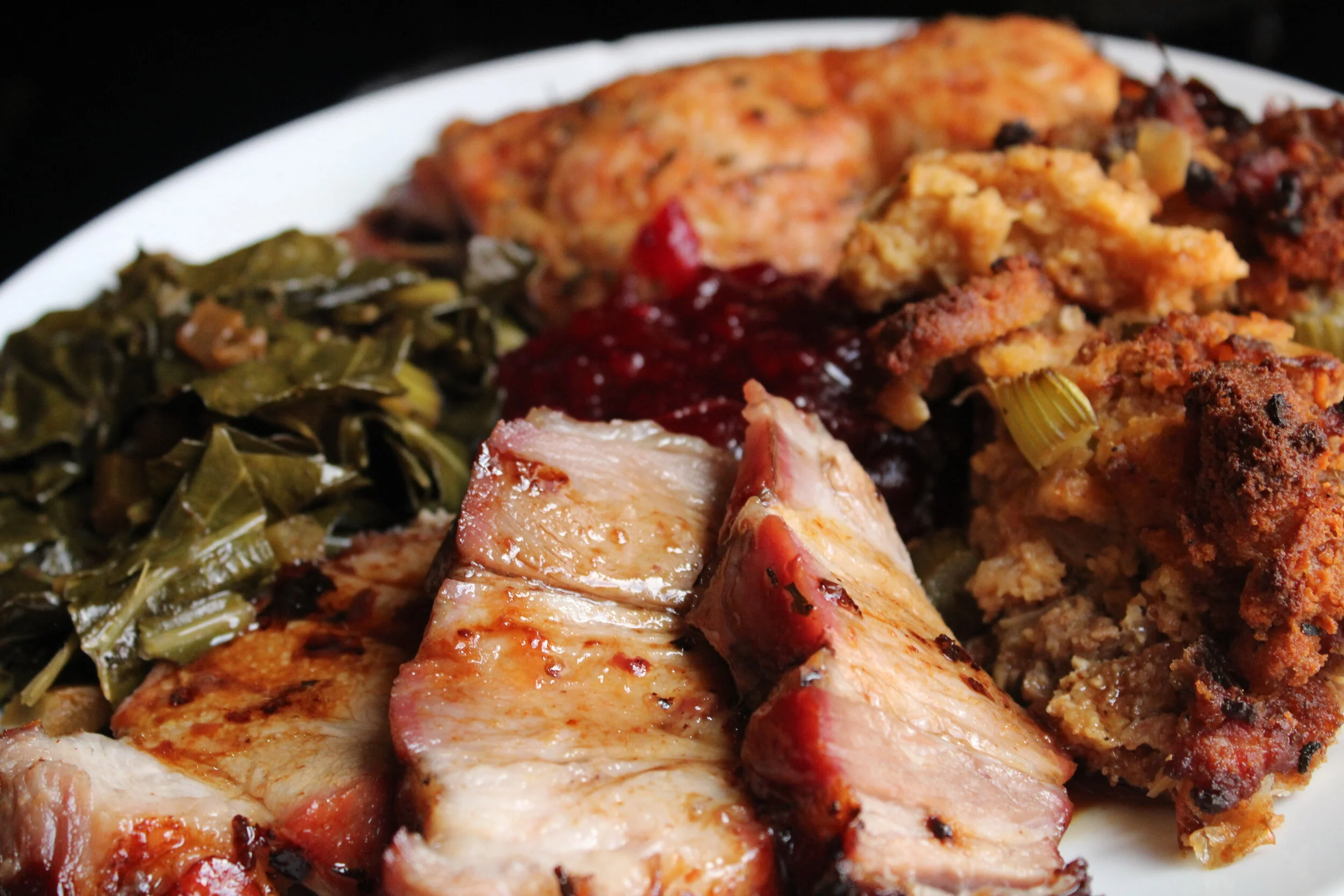 A plate of collards, sage sausage stuffing, cranberry sauce, brown sugar ham, and roasted chicken. Missing are “parker house” rolls and gravy.